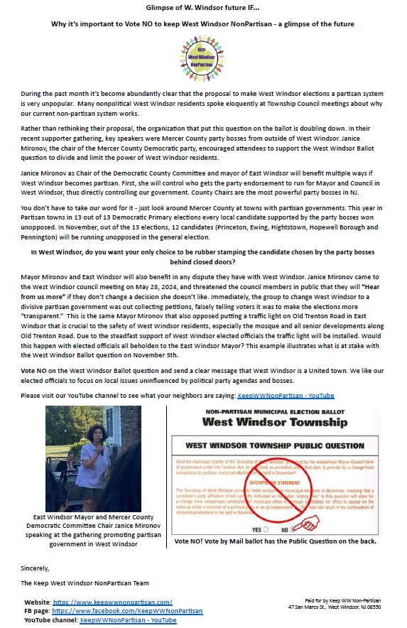 West Windsor, NJ - December 8, 2025 - Keep West Windsor NonPartisan was formed in the summer of 2024, to advocate against a ballot question that would have turned our municipal elections in West Windsor, NJ from “nonpartisan” to “partisan”. Our grassroots “Vote NO” campaign prevailed by a resounding 2-1 margin, reaffirming that residents want to keep partisan influence out of our local elections. We believed our mission was over. Unfortunately, recent filings suggest that individuals both inside and outside of West Windsor continue to push partisan involvement in our municipal elections.