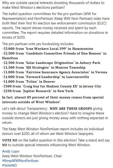 When West Windsor’s electorate voted to preserve our nonpartisan elections in November 2024 by a 2-1 margin, they sent a clear message: partisan influence, including partisan funding, has no place in our local elections.