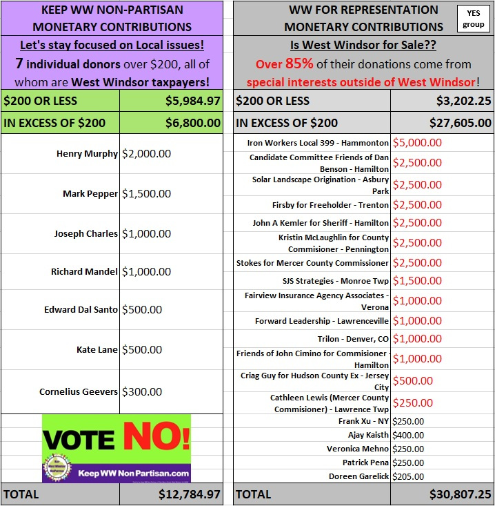 Nearly 90% of their donations come from special interests outside of West Windsor!