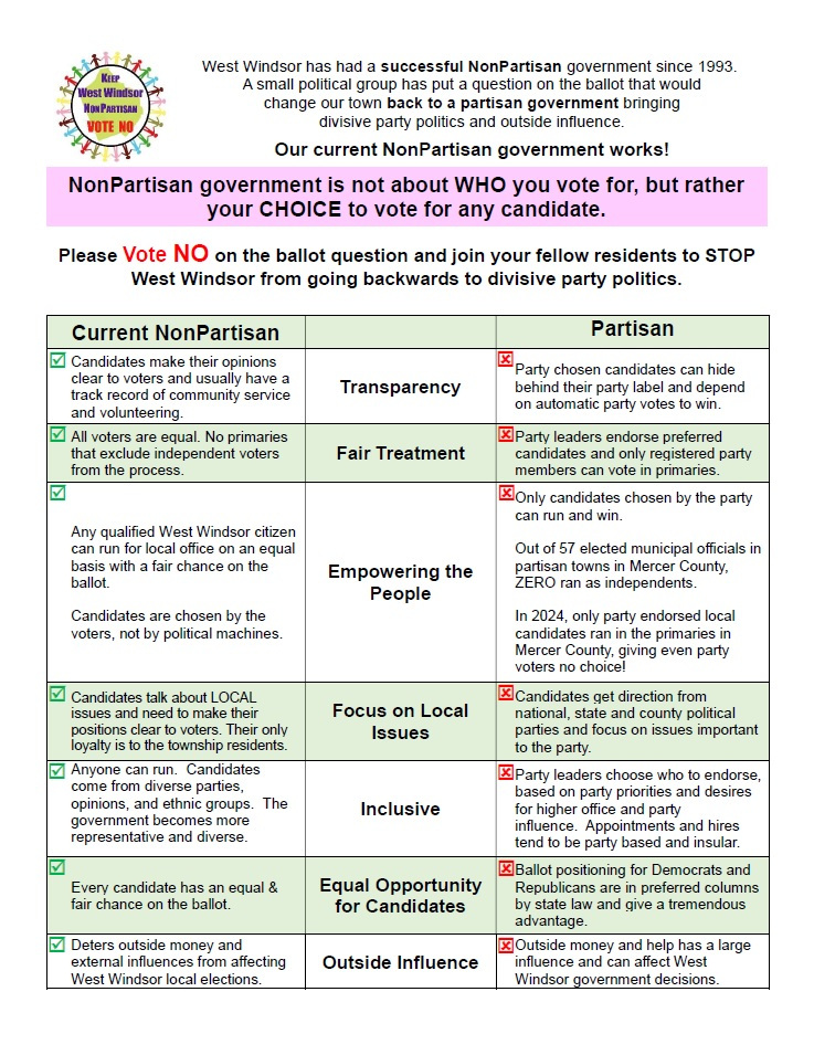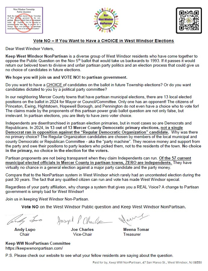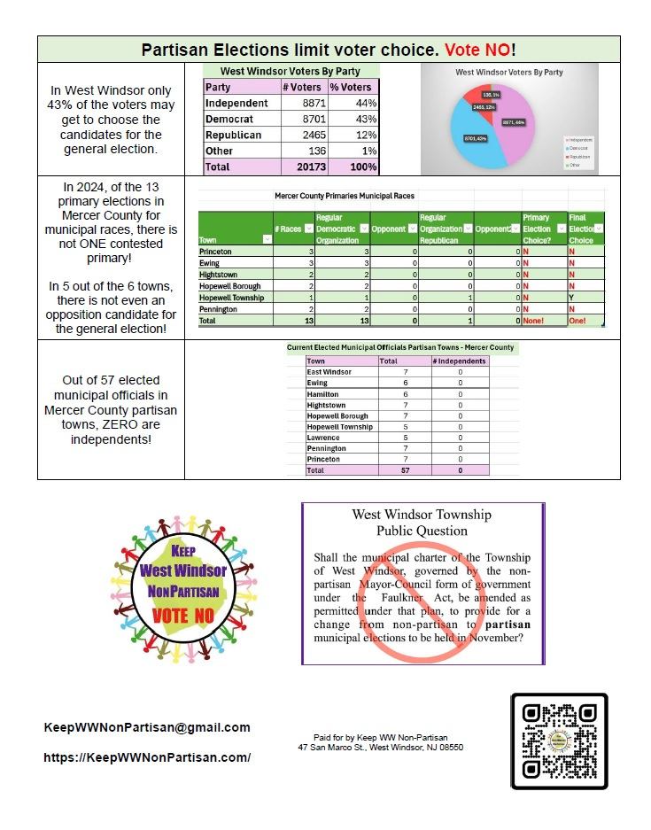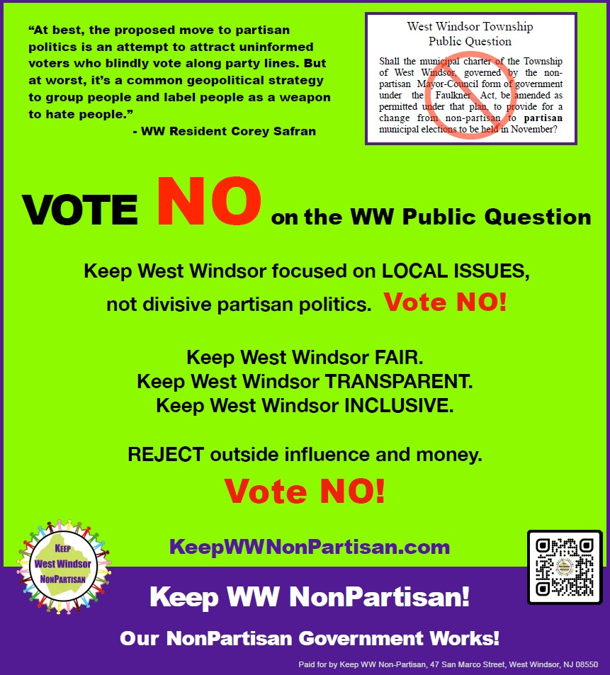 West Windsor, NJ - December 8, 2025 - Keep West Windsor NonPartisan was formed in the summer of 2024, to advocate against a ballot question that would have turned our municipal elections in West Windsor, NJ from “nonpartisan” to “partisan”. Our grassroots “Vote NO” campaign prevailed by a resounding 2-1 margin, reaffirming that residents want to keep partisan influence out of our local elections. We believed our mission was over. Unfortunately, recent filings suggest that individuals both inside and outside of West Windsor continue to push partisan involvement in our municipal elections.